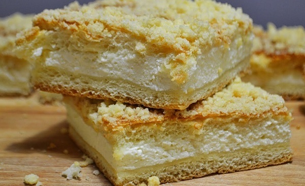 Інгредієнти: для тіста — 3 склянки борошна, 250 г маргарину або вершкового масла, 0,5 склянки цукру, 0,5 ч. л. соди; для начинки — 500 г сиру, 0,5 склянки сметани, цукор, цедра лимона і родзинки — за смаком, 1/3 ч. л. соди, 2 ч. л. крохмалю.