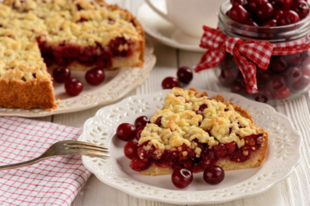 Інгредієнти: пшеничне борошно — 400 г, вершкове масло — 200 г, цукор — 200 г, яйця — 1 шт., сіль — 0,5 ч. л., розпушувач — 1 ч. л., вишня (можна використовувати заморожену) — 800 г, крохмаль — 2 ст. л.