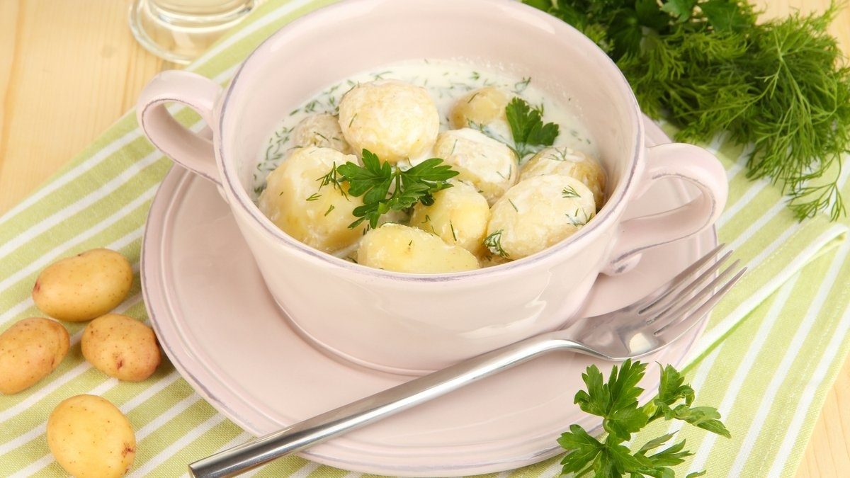 - Викласти картоплю у глибоку миску, додати масло та перемішати. Зверху посипати порізаним кропом.