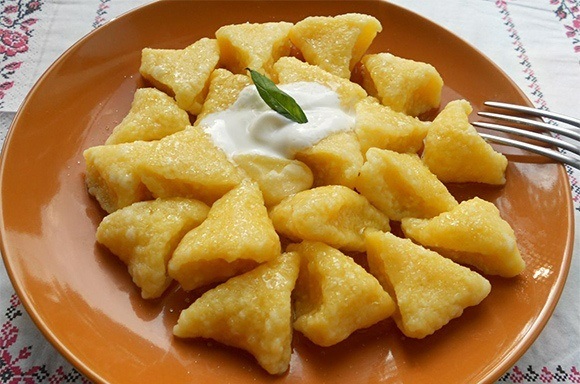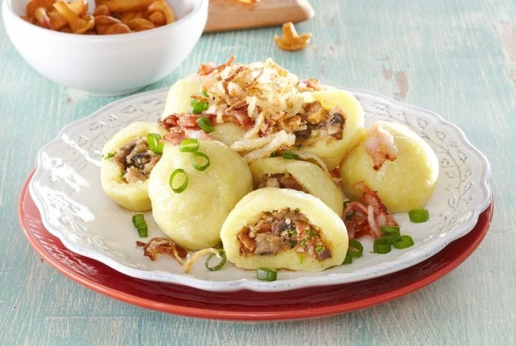 - Сало з цибулею нарізаємо кубиками, смажимо до готовності. Поливаємо готові кнедлики засмажкою.