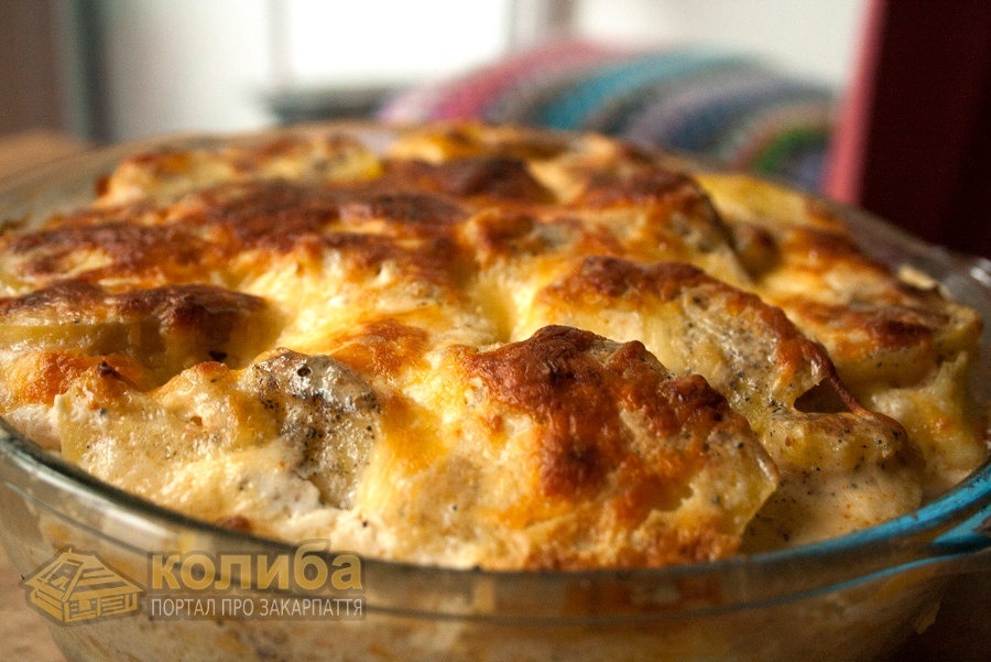 - Залити отриманою сумішшю картоплю, накрити форму фольгою і поставити в духовку. Запікати 1 годину при температурі 130 градусів. Потім зняти фольгу, збільшити температуру до 180-200 градусів і запікати ще півгодини до утворення рум'яної скоринки.
