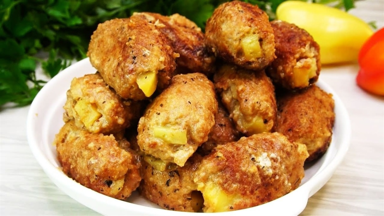 - Формуємо котлети: фарш перетворюємо в коржик, всередину кладемо шматочок картоплі і защипуємо краї.