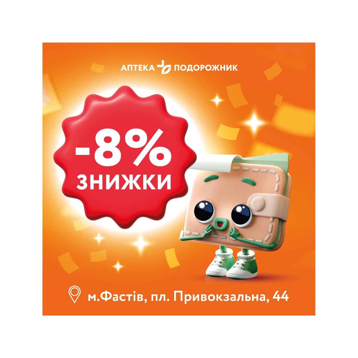 Знижка -8% діє тільки на товари, придбані саме в цій аптеці «Подорожник».