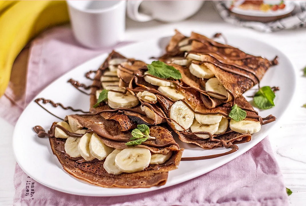 Інгредієнти: борошно – 200 г, молоко – 400 мл, яйце – 1 шт., банан – 1 шт., шоколад – 50 г, цукор, сіль – за смаком, масло – для сковороди.