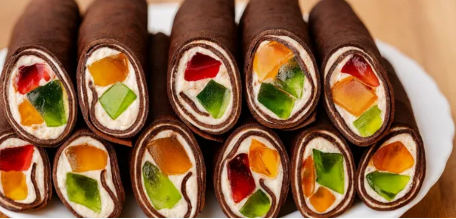 Процес формування млинців: желатин попередньо залити водою і залишити на 10 хвилин, щоб набух. До сметани додати цукрову пудру та збити. Желатин розтопити на водяній бані (можна у мікрохвильовці), додати до сметани та перемішати. Желе порізати на смужки. На млинці викласти сметанковий крем. В середину покласти желе. Скрутити рулетиком і поставити в холодильник до повного застигання.