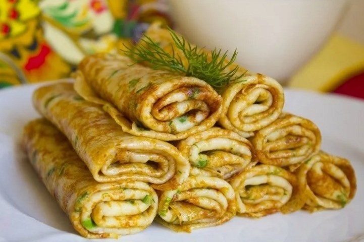 Млинці із сиром та зеленню можна скласти у вигляді трикутничків або згорнути трубочками. Чи наповнити їх начинкою.