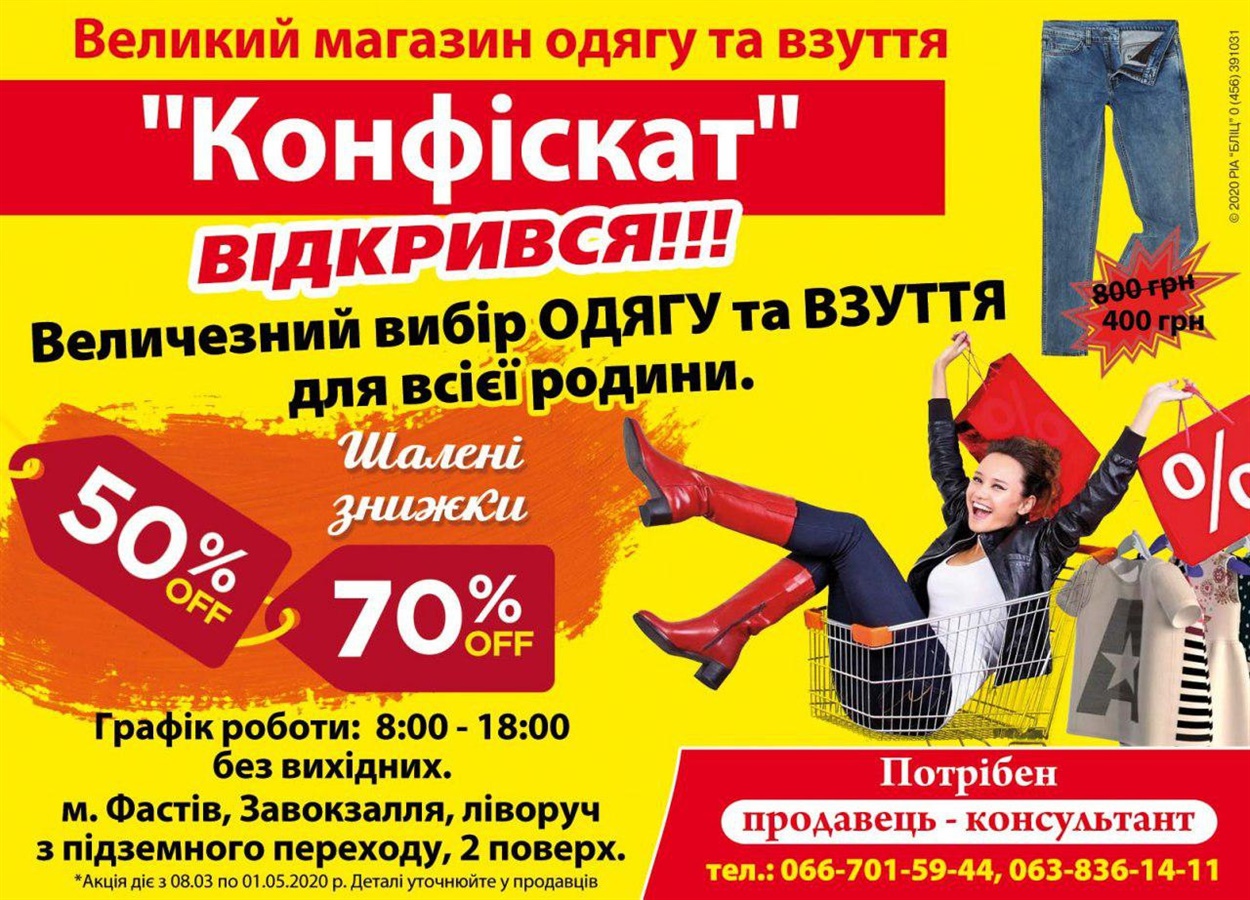 Але одягнутися не на всі гроші можна у магазинах «Конфіскат», які відкриваються по всій країні. Так і у Фастові 11 травня офіційне відкриття великого магазину одягу та взуття «Конфіскат».